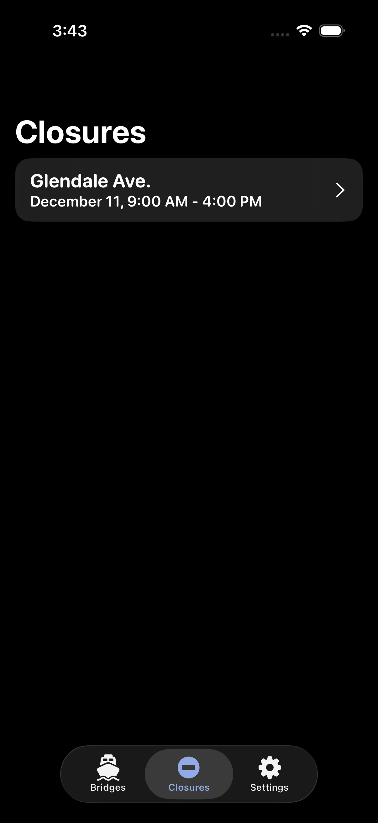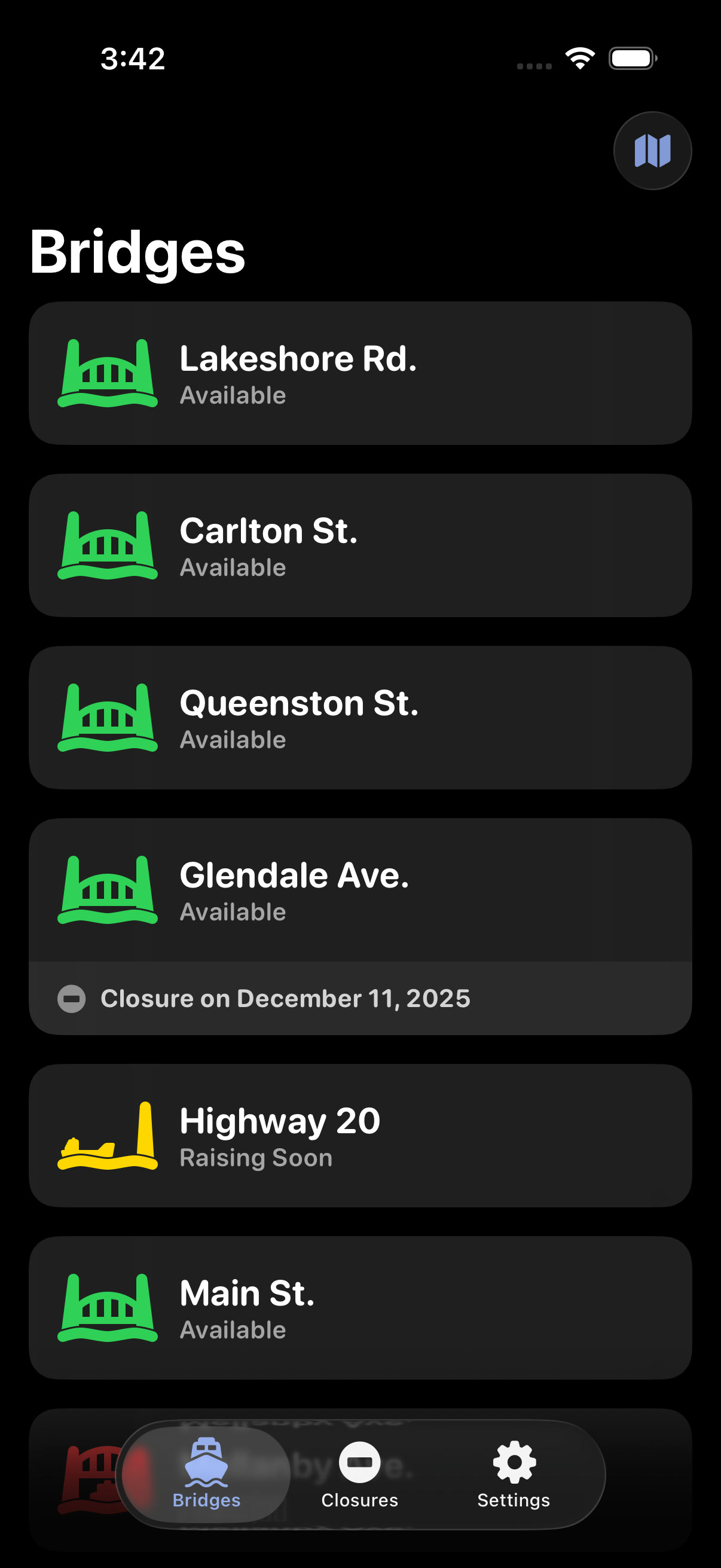 Niagara Bridges is an iOS app that uses real-time data to inform users about the status of lift bridges along the Welland Canal. Niagara Bridges supports App Shortcuts, widgets, and timed notifications using App Shortcuts to keep users updated when they need it. Check real-time lift bridge status before you leave, so you're never stuck waiting at the Welland Canal again.