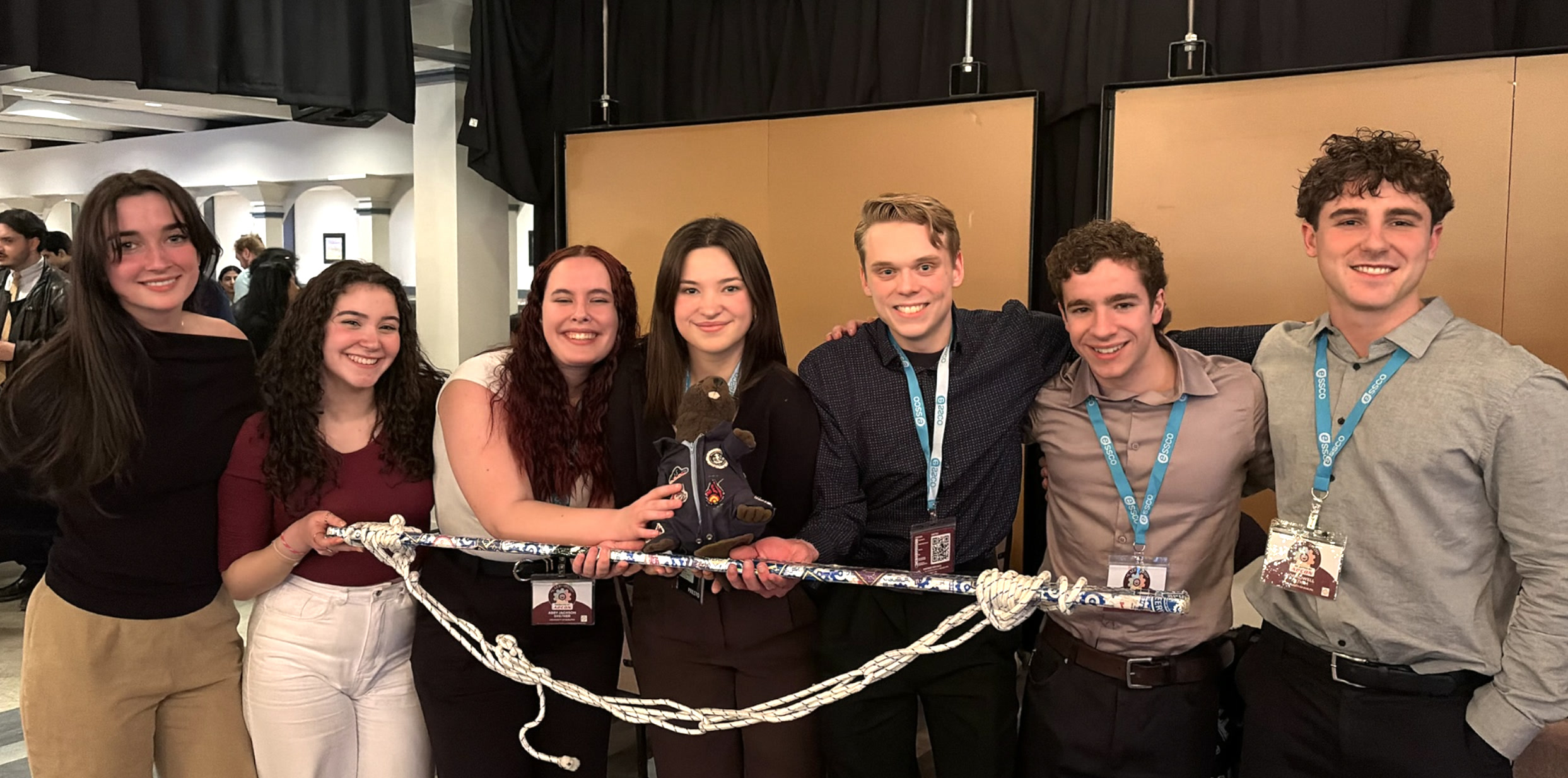 Guelph's delegates at the Friday social event. We stole Windsor's mascot, and nobody stole our mascot: the stick!